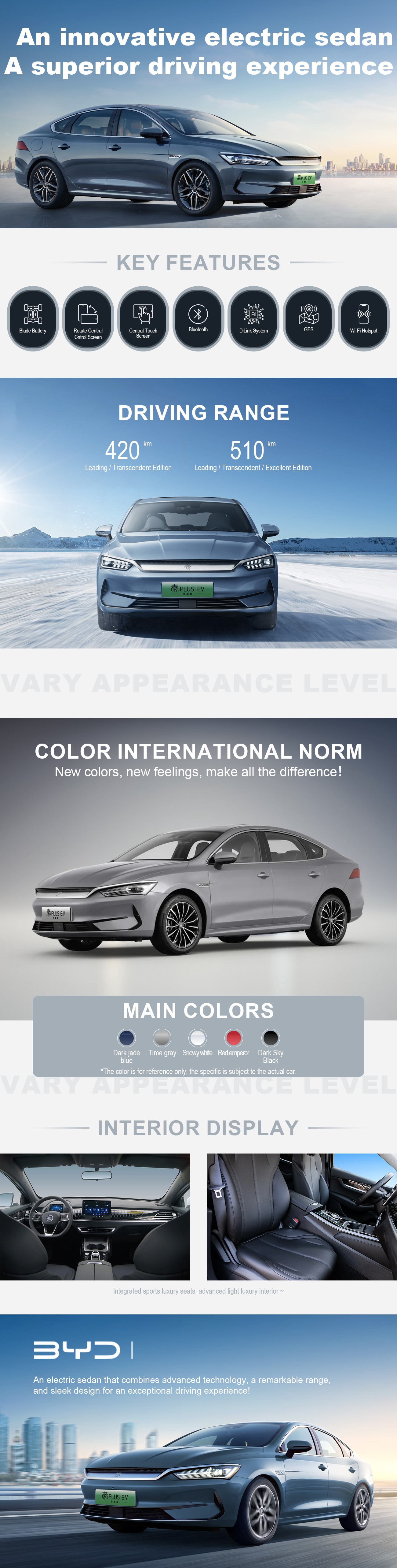 The BYD Qin PLUS EV is a cutting-edge electric sedan that combines efficiency, performance, and sleek design. Powered by an advanced electric drivetrain, it offers an impressive range and quick acceleration, making it an ideal choice for eco-conscious drivers. The exterior features a modern, aerodynamic design, while the interior provides a spacious and luxurious experience with the latest infotainment and safety technologies. The Qin PLUS EV ensures a smooth and responsive ride, with ample cabin space and comfort for all passengers. Perfect for those seeking a stylish and sustainable vehicle, the BYD Qin PLUS EV represents the future of electric mobility.