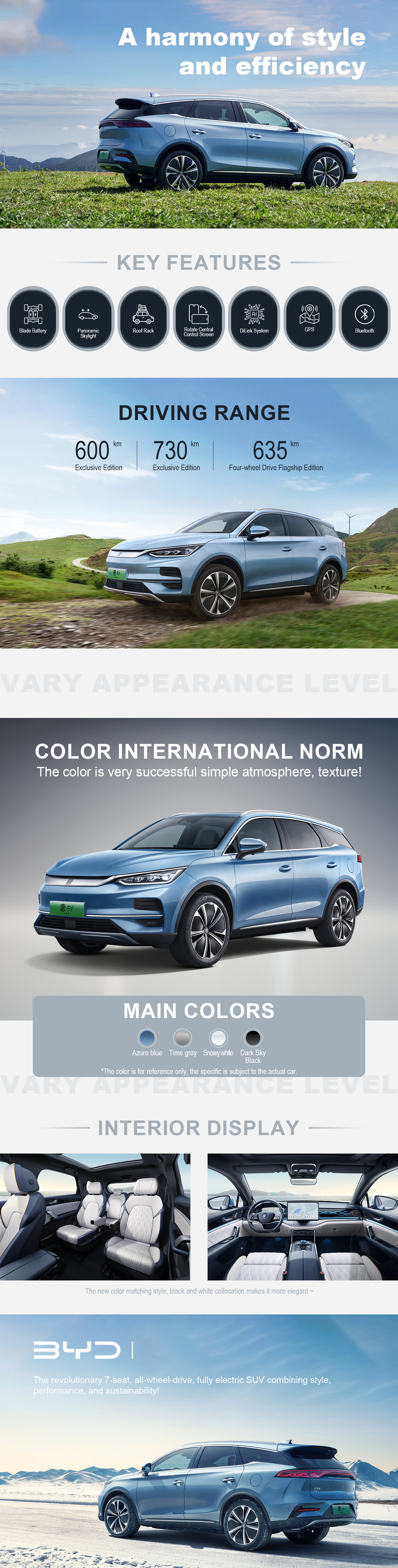 The BYD TANG EV is a pure electric SUV that blends advanced technology with robust performance and sleek design. Offering an impressive range and rapid acceleration, it’s perfect for city commutes and long-distance travel alike. The stylish exterior is complemented by a spacious, luxurious interior, featuring the latest in infotainment and safety technology for a comfortable and secure ride. The TANG EV delivers a smooth, quiet driving experience with a focus on sustainability. Ideal for eco-conscious drivers, the BYD TANG EV epitomizes electric mobility, combining efficiency, innovation, and elegance in a sophisticated package.