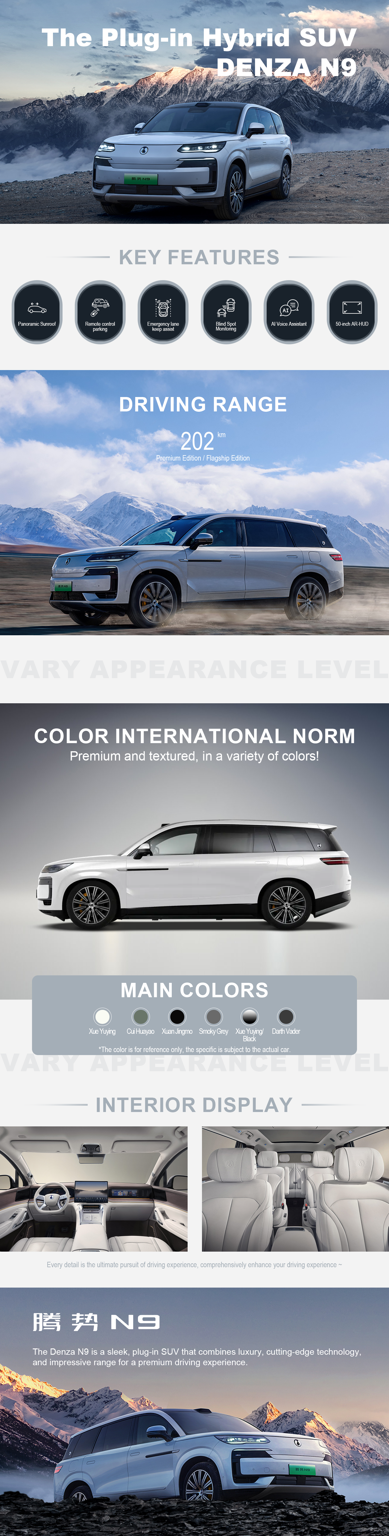 Being Denza’s flagship SUV, the N9 boasts top-tier performance and technology. It is powered by BYD’s e3 three-motor system, consisting of a front AC asynchronous electric motor producing 200 kW (268 hp) and two rear permanent magnet synchronous motors generating 240 kW each. These electric motors are complemented by a turbocharged 2.0-liter petrol engine outputting 152 kW (204 hp). The entire system is paired with a 46.9 kWh Blade battery pack, delivering a combined power output of 680 kW (925 hp). This enables the Denza N9 to accelerate from 0 to 100 km/h in just 3.9 seconds.