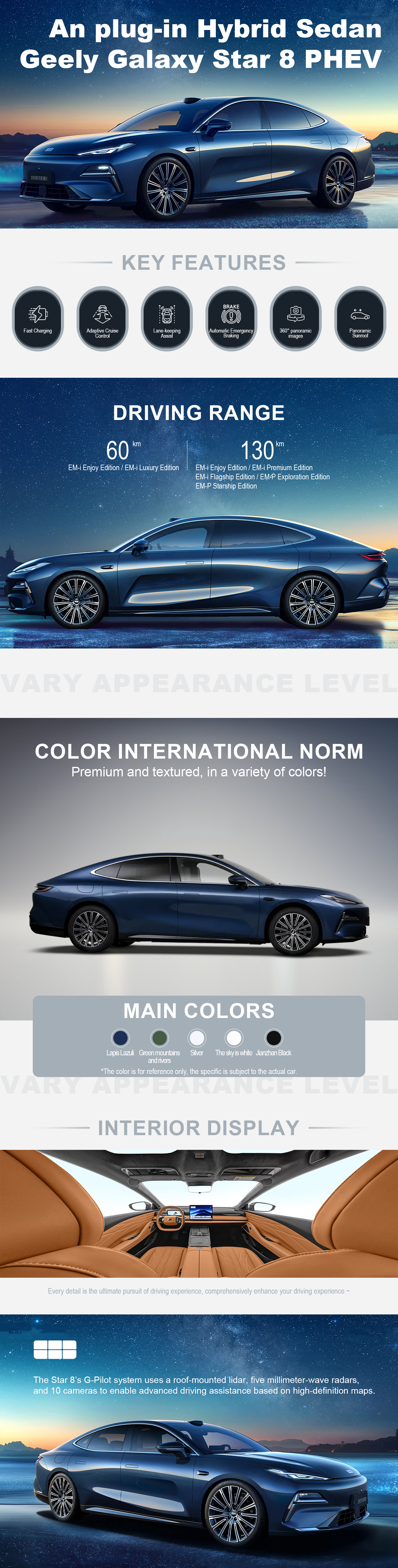 Geely Galaxy’s plug-in hybrid sedan, Geely Galaxy Star 8 is powered by Geely’s self-developed next-generation NordThor plug-in hybrid system, offering 60km and 130 km CLTC pure electric ranges, and is equipped with G-Pilot intelligent driving system. Popular design elements including hidden door handles, frameless windows, slender headlights, through-type taillights , and a fastback shape are present. The car runs on 19-inch rims.