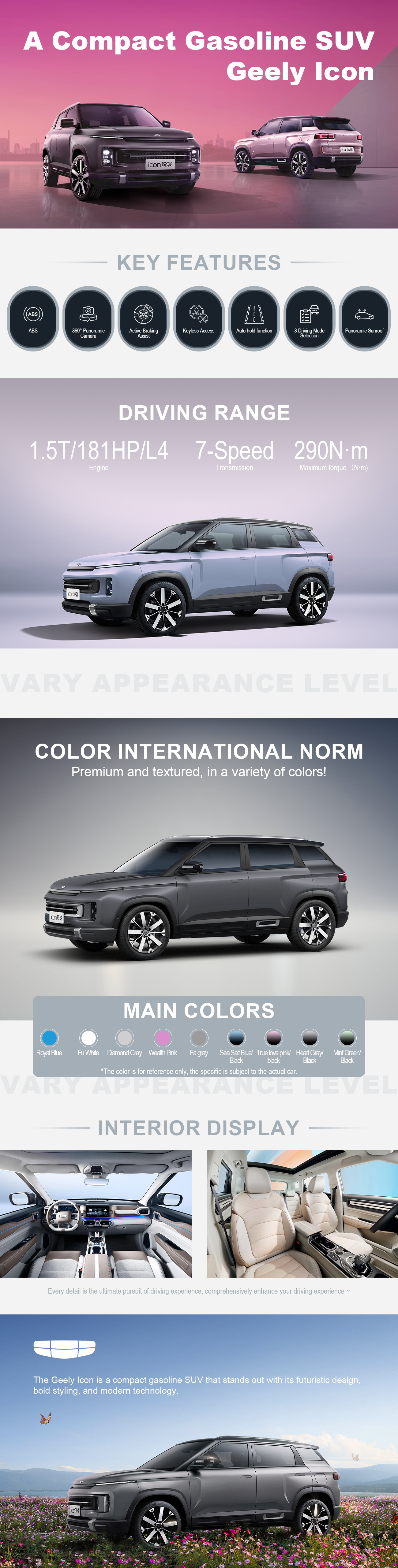 The Geely Icon is a distinctive and contemporary compact SUV that stands out with its eye-catching design and innovative features. Its futuristic exterior showcases sharp angles and a bold silhouette, reflecting a modern aesthetic that appeals to urban drivers.