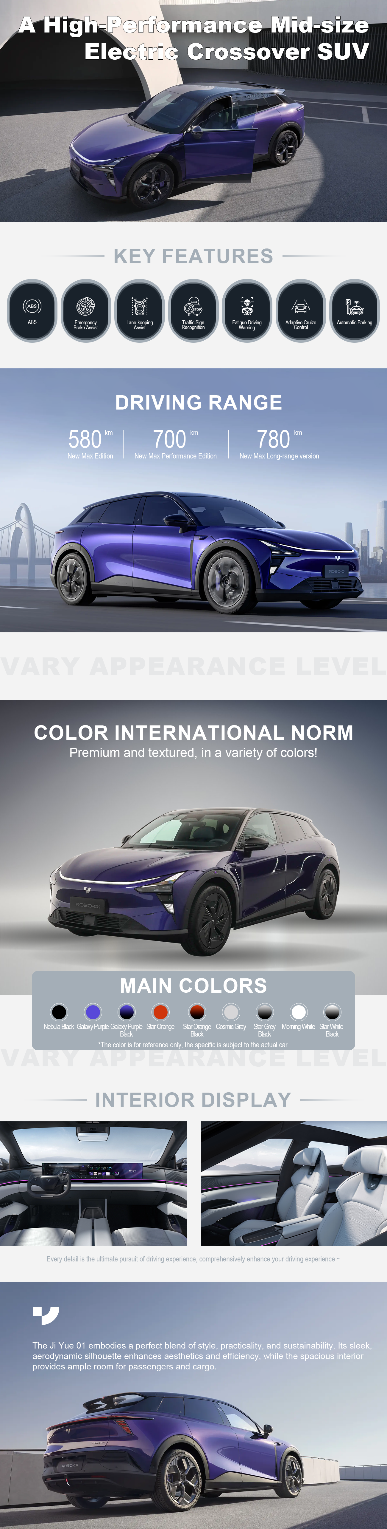Powered by an advanced electric drivetrain, the Ji Yue 01 offers excellent acceleration and a quiet, smooth ride. Its high-capacity battery ensures a long driving range on a single charge, making it suitable for both urban commutes and long-distance travel. Fast-charging capability also ensures minimal downtime, allowing drivers to quickly recharge and get back on the road.