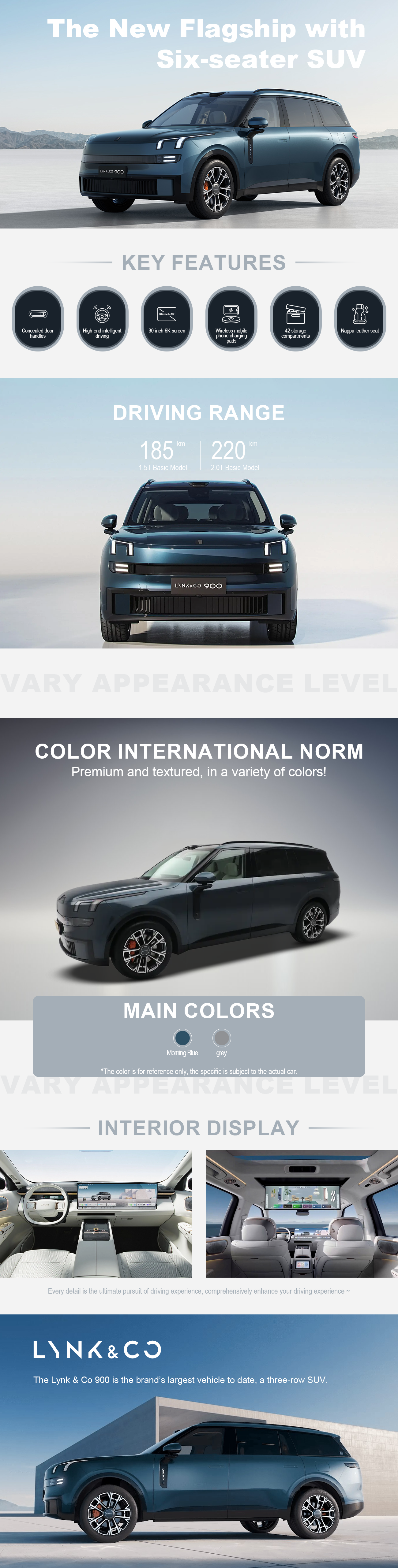 The Lynk & Co 900 come with a Freevoy 52.38 kWH battery pack from CATL. It has 280km of electric range under CLTC conditions. Moreover, the car can charge from 20 to 80% in 17 minutes. It is the brand’s flageship SUV with a plug-in hybrid powertrain.
