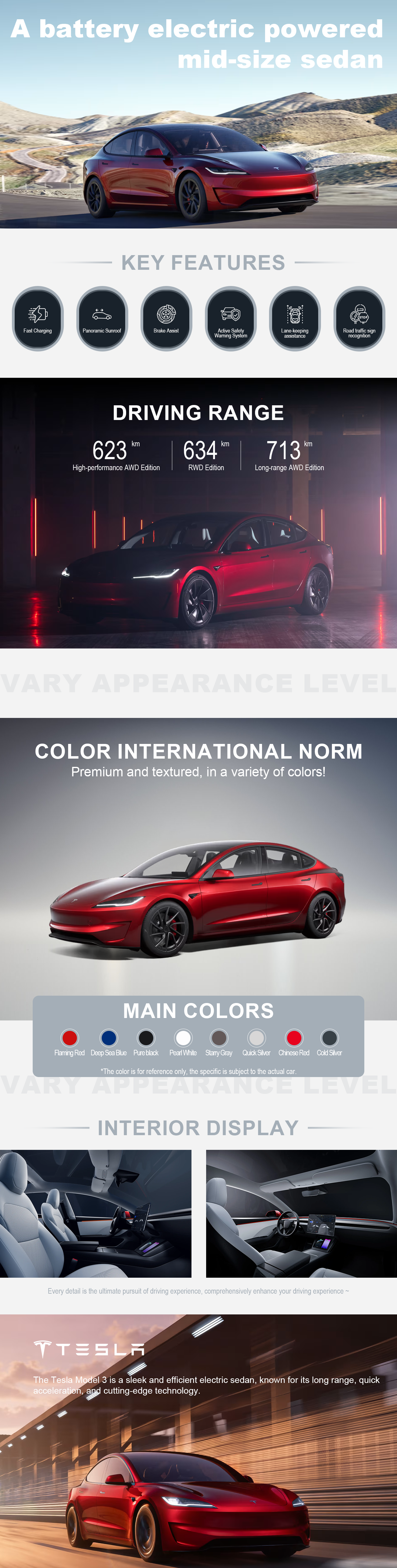 The Tesla Model 3 is a battery electric powered mid-size sedan. The vehicle is marketed as being more affordable to more people than previous models made by Tesla. Go up to 363 miles (EPA est.) on a single charge with updated exterior styling optimized for maximum aerodynamics.